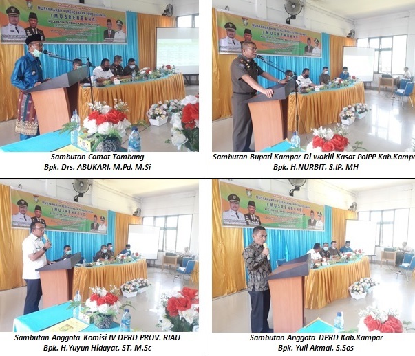 Tambang- Musyawarah Rencana Pembangunan(Musrenbang) kecamatan Tambang tahun 2021 di buka oleh Kasat POLPP Kab.Kampar Bpk. H.NURBIT, S.IP, MH mewakili Bupati Kampar H. Catur Sugeng Susanto, SH ,Dalam kesempatan ini turut menghadiri anggota Komisi IV DPRD provinsi Riau Yuyun Hidayat, ST. M.Sc, anggota DPRD kabupaten Kampar Yuli Akmal , S. Sos, serta Ninik mamak dan Tokoh Masyarakat Kecamatan Tambang pada hari Kamis pagi (25/02/2021) di aula kantor camat Tambang.